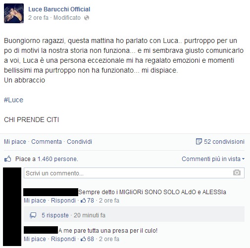 Poco dopo anche Luca ha lasciato un messaggio sulla sua pagina Facebook, scrivendo: