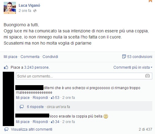 “Buongiorno a tutti, Oggi Luce mi ha comunicato la sua intenzione di non essere più una coppia, mi spiace, io non rinnego nulla la scelta l’ho fatta con il cuore. Scusatemi ma non ho molta voglia di parlarne”