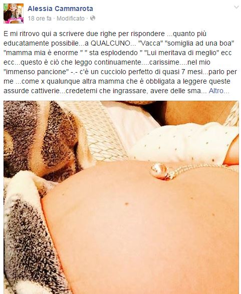 “E mi ritrovo qui a scrivere due righe per rispondere …quanto più educatamente possibile…a QUALCUNO… “Vacca” “somiglia ad una boa” “mamma mia è enorme ” ” sta esplodendo ” “Lui meritava di meglio” ecc ecc…questo è ciò che leggo continuamente….carissime….nel mio “immenso pancione” -_- c’è un cucciolo perfetto di quasi 7 mesi…parlo per me …come x qualunque altra mamma che è obbligata a leggere queste assurde cattiverie…credetemi che ingrassare, avere delle smagliature, non essere padrone del proprio corpo per nove mesi per far posto al nostro dolce inquilino …