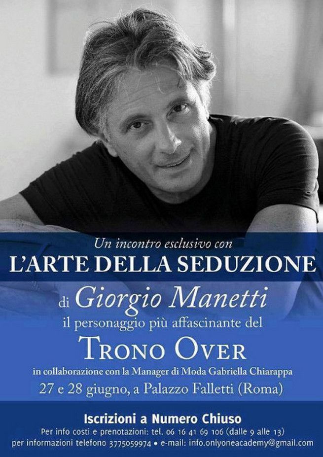 Il personaggio del trono over a Uomini e Donne, protagonista della turbolenta storia con Gemma Galgani conclusasi (drammaticamente per lei) solo qualche giorno fa dopo una puntata speciale del programma in prima serata, sale in cattedra. Nelle ultime ore, infatti, sta e circolando una locandina sul web che invita ad iscriversi al corso di Manetti incentrato proprio sull’arte della seduzione. In particolare, la locandina che sponsorizza “un incontro esclusivo con l’arte della seduzione di Giorgio Manetti, il personaggio più affascinante del trono over” a Palazzo Falletti, a Roma.