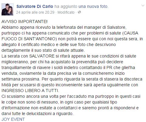 “Avviso importante! Abbiamo appena ricevuto la telefonata del manager di Salvatore, purtroppo ci ha appena comunicato che per problemi di salute (causa fuoco di sant’Antonio) non potrà essere qui con noi questa sera, in allegato il certificato medico e delle sue foto che descrivono dettagliatamente il suo stato di salute attuale”.