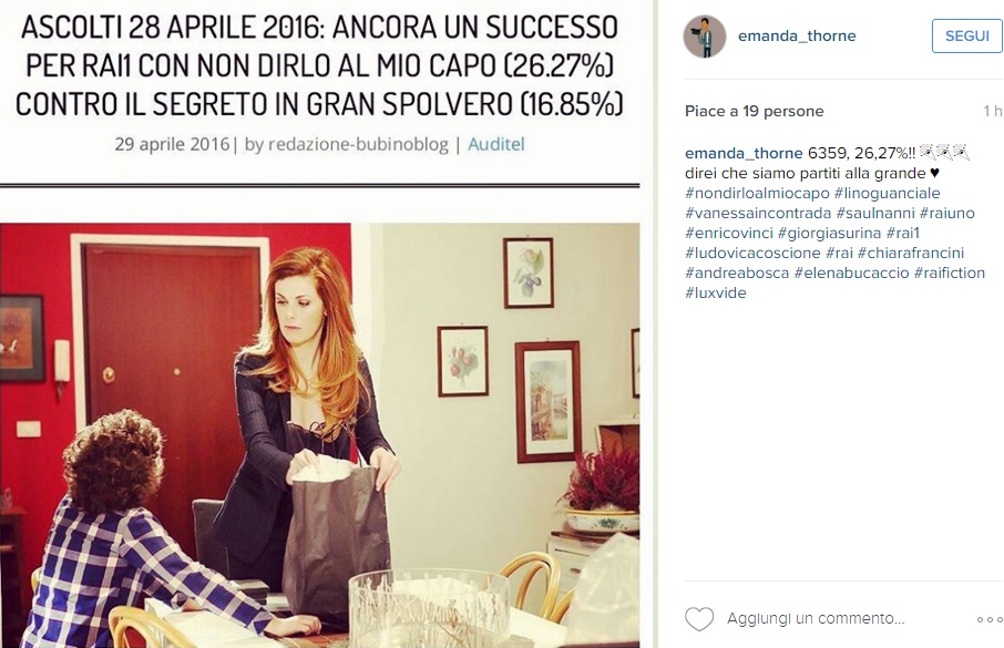 Insomma, partenza alla grande per la nuova fiction con protagonisti la simpaticissima e bravissima Vanessa Incontrada e Lino Guanciale. Non era semplice perché la fiction accoglie “l’eredità” di Don Matteo nel palinsesto del giovedì sera di Rai 1. “Non dirlo al mio capo” non ha deluso le aspettative, ottenendo ascolti in media con i migliori prodotti della stagione Rai, che quanto a fiction televisive negli ultimi tempi può dirsi davvero soddisfatta, non solo per le conferme del successo debordante di prodotti come Don Matteo e Il commissario Montalbano, ma anche per come sono state accolte le nuove fiction come “Una pallottola nel cuore 2” con Gigi Proietti o “Baciato dal sole” con Giuseppe Zeno. Non dirlo al mio capo ha tenuto nettamente testa alla concorrenza de Il segreto, totalizzando cifre pari a quasi il doppio di Canale 5.