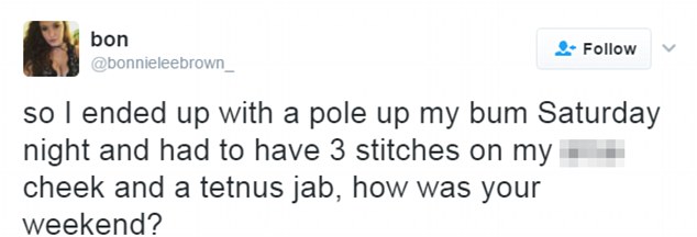Il video ha già ricevuto oltre 27mila retweet. La clip dura in tutto cinque secondi e mostra Bonnie che balla con una sua amica. La giovane ride e non sa che dietro di lei si trova questo paletto bianco che le costerà tre punti di sutura. “Dovreste vedere il mio sedere. E’ così schiacciato ed irreale” conclude la giovane che ha ricevuto decine di commenti ironici.