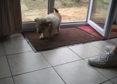 Il cane entra in casa e pulisce le zampe sul tappeto (Video)