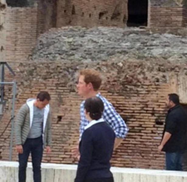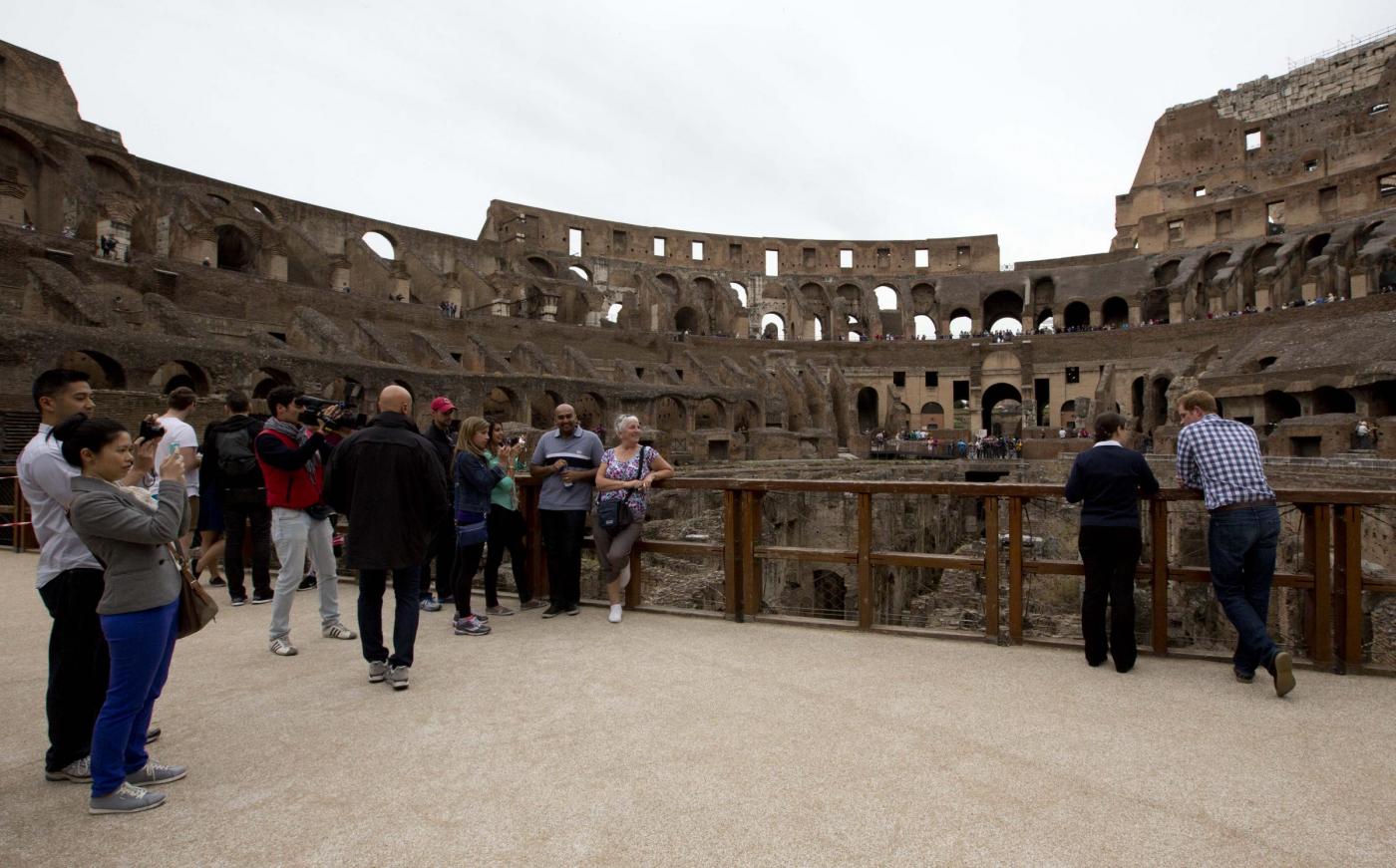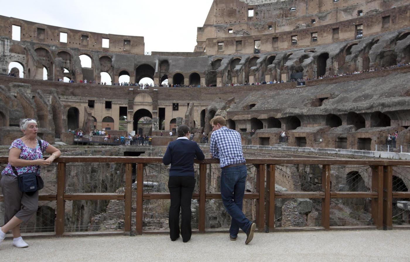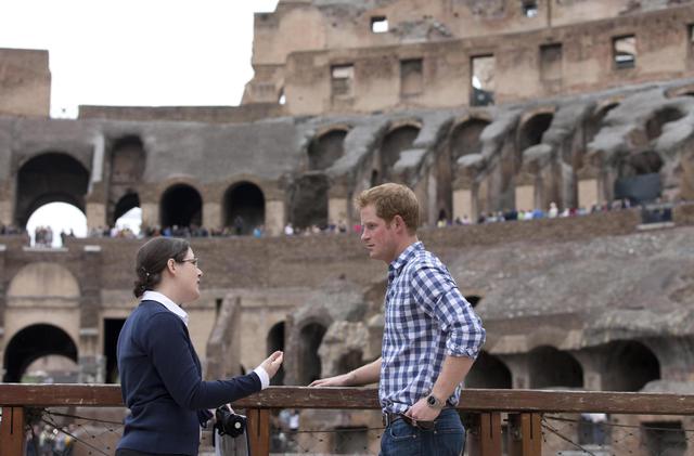 Britain's Prince Harry (r) listens to Italian guide Laura Ciglioni as he tours the Colosseum, in Rome, Monday, May 19, 2014. The Colosseum was the largest amphitheater of the Roman Empire and is today one of Rome's best know landmarks. Prince Harry is in Italy for a three-day visit to commemorate the 70th anniversary of the WWII's Monte Cassino battle. ANSA/ POOL- AP Photo/Alessandra Tarantino
