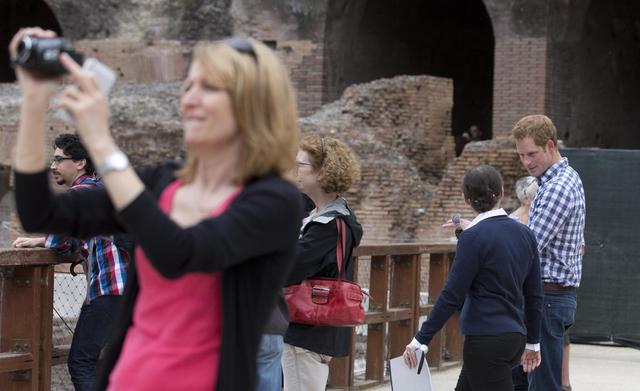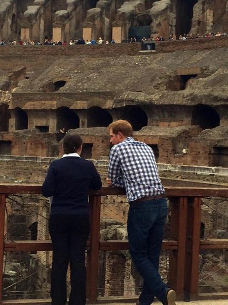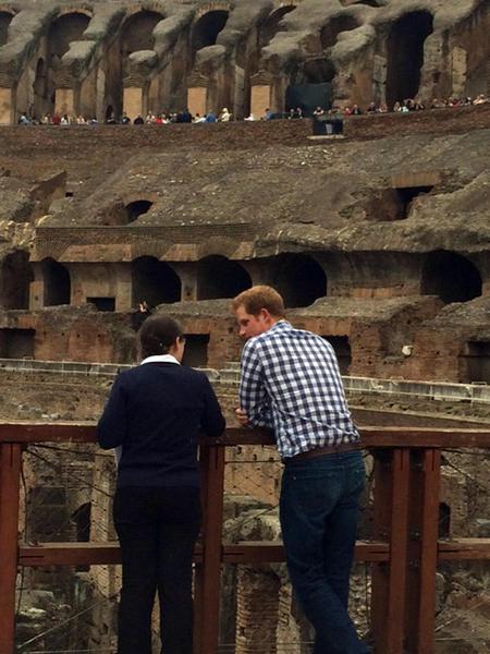 Britain's Prince Harry (r) is flanked by Italian guide Laura Ciglioni as he tours the Colosseum, in Rome, Monday, May 19, 2014. The Colosseum was the largest amphitheater of the Roman Empire and is today one of Rome's best know landmarks. Prince Harry is in Italy for a three-day visit to commemorate the 70th anniversary of the WWII's Monte Cassino battle. ANSA/ POOL- AP Photo/Alessandra Tarantino