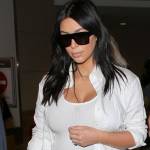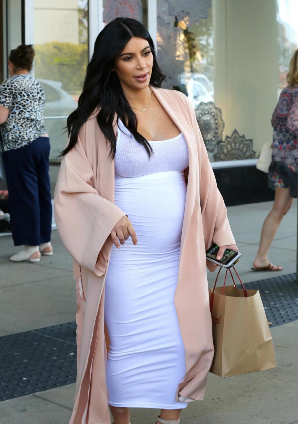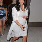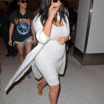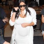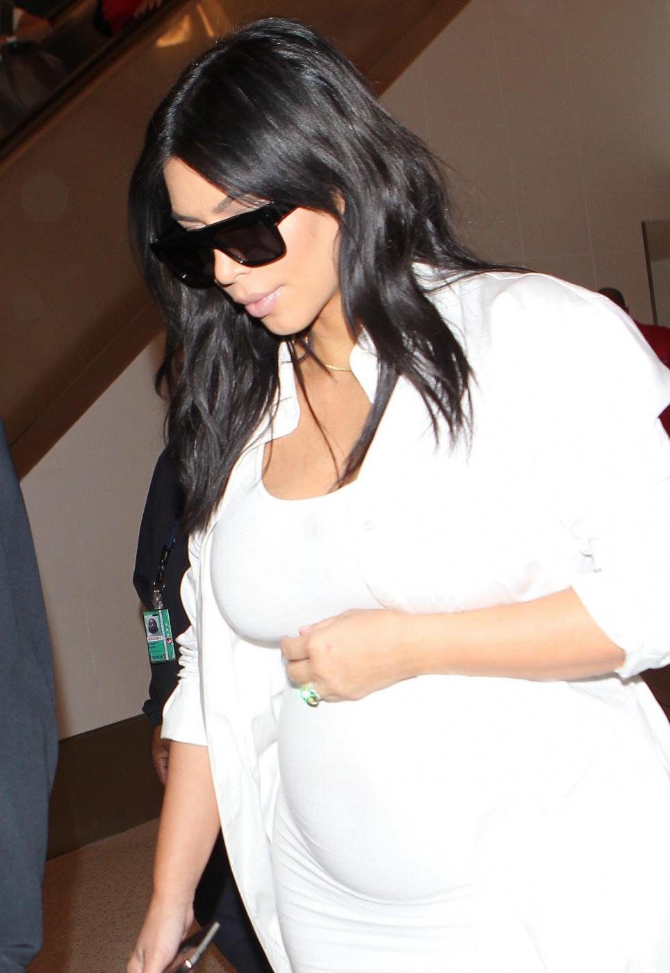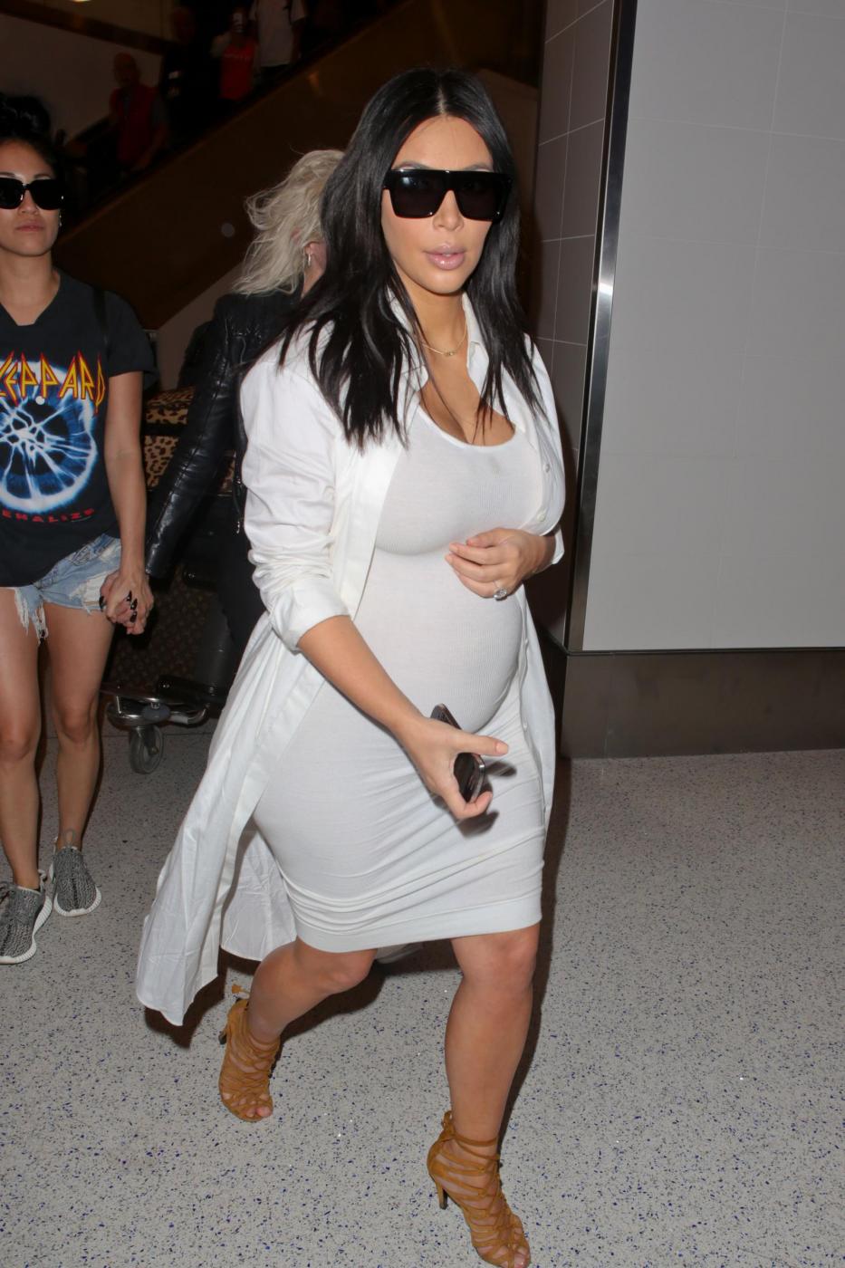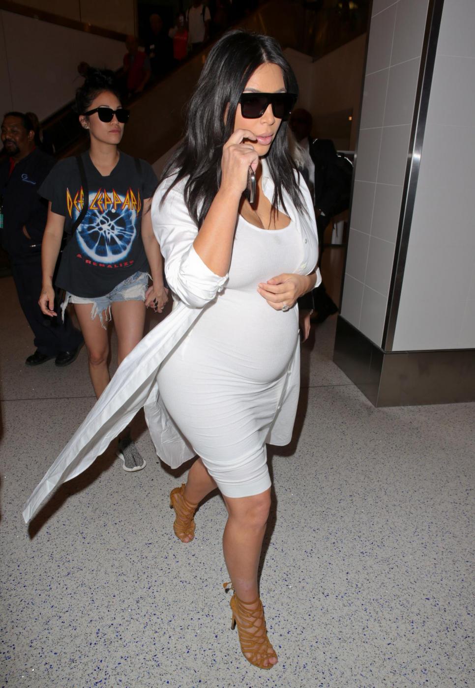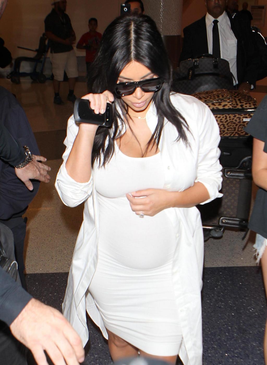 Kim Kardashian si tiene il suo pancione all'aereoporto Kim Kardashian holds her growing baby bump Kim Kardashian arrives at LAX in looking a tad uncomfortable holding her belly in a skintight white dress that displayed her growing bump and strappy beige high heels. She spent the night before masquerading around New Orleans in all-black but arrived back in LA and has not taken a break during her pregnancy. Perez/X17online.com LaPresse -- Only Italy