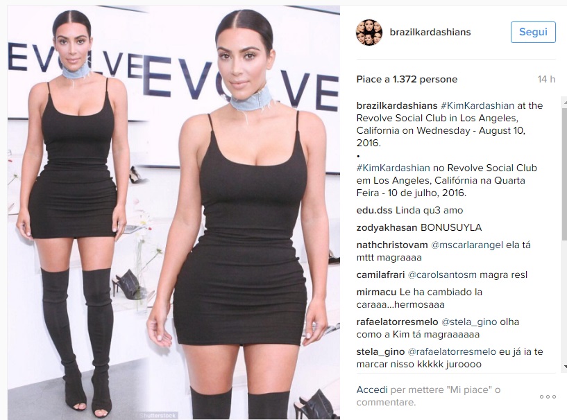 Come scrivono diversi commentatori su Instagram, il vestito risalata le forme di Kim e specialmente il suo lato B che sembra più grande del solito. Lei però, recentemente ha ammesso che anche quello sta diminuendo. La Kardashian infatti si è messa a dieta dopo aver guadagnato 50 chili durante il parto, che ora ha perso: “Nella vita – raccontava la showgirl a gennaio – ero stata sovrappeso al massimo di qualche chilo. Durante la gravidanza ne avevo presi 56. Ora sono solo a 6 chili dal mio obbiettivo”.