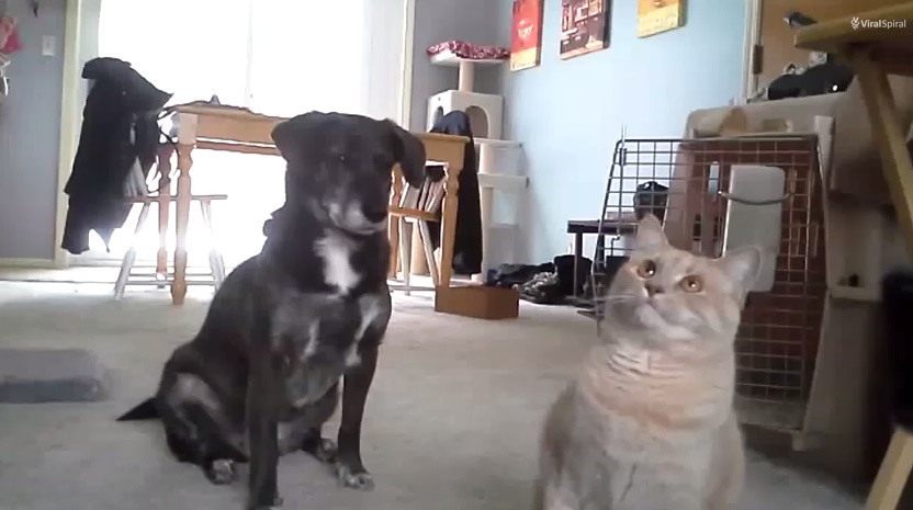 ROMA – Un cane e un gatto si sfidano e chi vince? Il felino. La gara consiste nel capire gli ordini della padrona. In palio ci sono dei gustosissimi croccantini: a trionfare è il gatto che riesce a capire meglio quello che la padrona sta dicendo e il cane, notoriamente più intelligente e addomesticabile del gatto, in questo caso resta deluso e soprattutto a bocca asciutta.