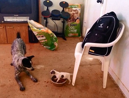 Ma il cagnetto in miniatura sembra quasi indemoniato e non ha intenzione di lasciare all’amico nemmeno un bocconcino, vanificando “l’attacco” grazie ad una sapiente combinazione di guaiti acuti, ringhi e atteggiamenti aggressivi.