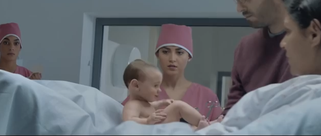 Nelle immagini si vede infatti un bambino che, appena nato è già in grado di cercare sul web le informazioni per tagliare da solo il suo cordone ombelicale.