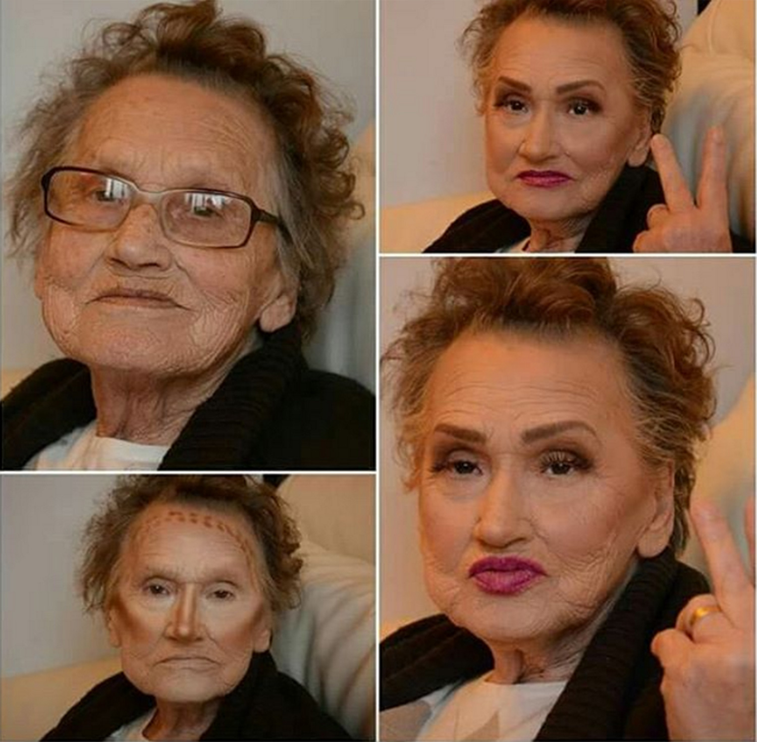 Quanto fatto dalla nipote è andato a buon fine: la truccatrice, ha utilizzato sulla nonna ed anche sulla madre il contouring, tecnica tipica del trucco fotografico diventata celebre nel mondo grazie a Kim Kardashian che consiste nel definire, scolpire e porre in evidenza i tratti del viso enfatizzando le naturali zone d’ombra e mettendo in risalto quelle colpite dalla luce.
